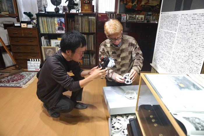 左がその白﨑さん。「当時発行されていた『パテー・シネ』などの雑誌も寄贈されてご覧に入れることができます」と伝えたら、もう一度戻ってこられたほどの熱心な取材でした。白﨑さんはNHK福井放送局に長く保存されていたままのパテ・ベビーフィルムの存在に気が付かれ、それについて取材を重ね、福井県域版の番組ディープザウルスで紹介しようと取り組んでおられました。で、先ずは、9.5㎜のフィルムが一体どういうものかを当館に調べに来られたのです。写真で連れ合いが手にしているのが、昨年9月に寄贈を受けた多数のパテ・ベビーフィルムのうちの1本です。全てデジタル化して、もう少し作業が残っていますが、あらかたをDVDにしてこのお正月、寄贈主様にお渡ししました。