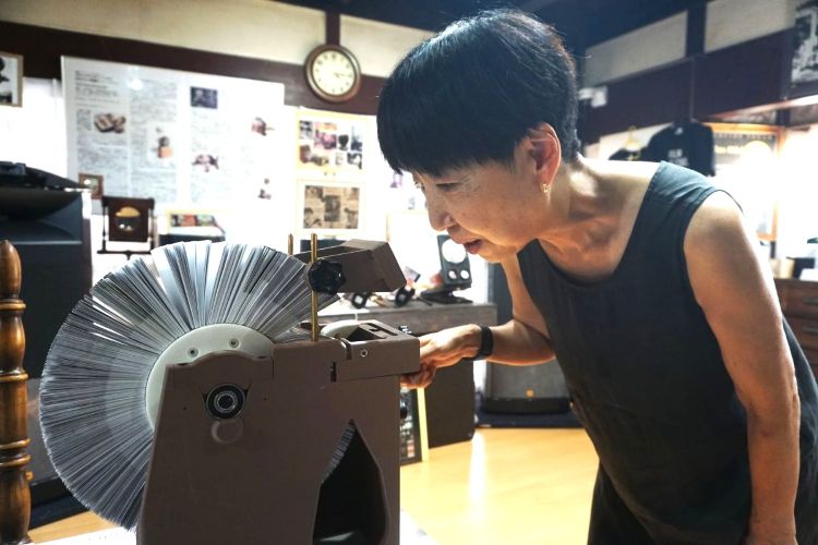 橋本式ミュートスコープを体験する大月さん。以前のミュージアムをご存じではないので、この装置を手回しして、どんなところだったか見てもらいました。