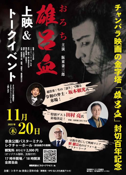撮影された奈良の地で、公開された日からちょうど100年後の11月20日に、剣劇王と呼ばれた阪東妻三郎主演『雄呂血』をご覧頂こうという趣向です。阪妻は、それまでの歌舞伎調の芝居から、腰を低くして獣のように俊敏に動き回る芝居へと一変させ、絶大な人気を誇りました。チャンバラ映画の金字塔と称されている『雄呂血』を観ながら、阪妻の記憶を未来へ繋いでもらえたらと願います。