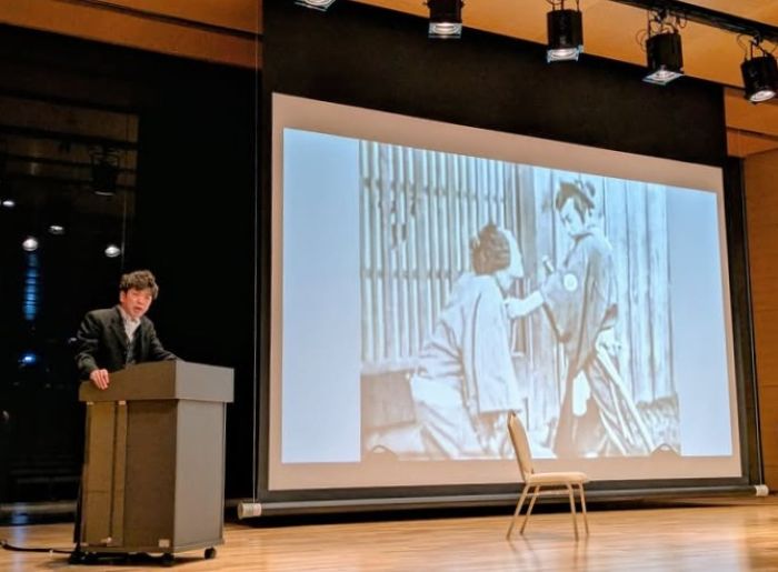 『雄呂血』上映前に活動写真弁士坂本頼光さんのお話。お客様の中には活弁付きで無声映画をご覧になるのが初めてという方もおられたでしょう。欧米では今も昔も無声映画は音楽付きで上映していますが、話芸が発達していた日本では、当初から活弁と演奏付きで上映していました。活弁は日本独特の文化です。その面白さを知っていただける場にもなりました。