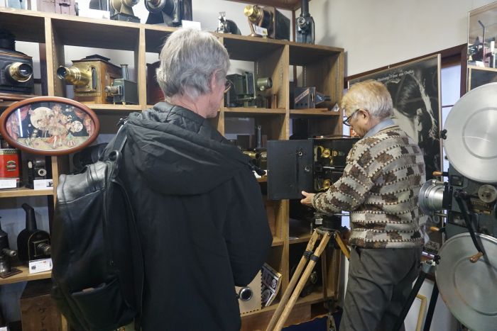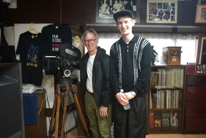 この日12月1日は“映画の日”。オーストラリアのブリスベンからWagne Taylorさんとご子息のSamさんが来館。映画好き大学生のSamさんは11月19日ブリスベン近代美術館で開催された「日本映画祭2025」スペシャルイベント“JAPANESE PAPER FILMS” をご覧になって関心を持たれたのだそうです。