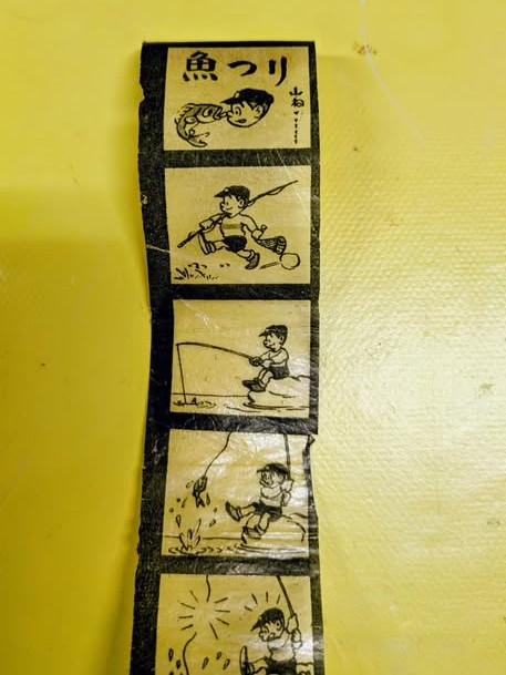 所蔵品の中にグリコのブリキ製幻灯機(2017年4月9日付けブログで紹介)があります。1955(昭和30)年に、特別プレゼント用に作られたもののようです。山根さん兄弟がプロとして仕事を始められた時期とも合うと思い、試しに紙製透過フィルムを装填してみました。
