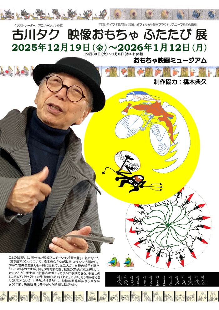 これは、明日1月12日まで開催している「 古川タク 映像おもちゃ ふたたび展」で楽しい作品の数々を展示してくださっている古川タクさん(イラストレーター、アニメーション作家、絵本作家、マンガ家と多忙面ご活躍)が、昨年5月17日に新装開店した当館を見に来てくださった折の記念写真(撮影は奥様)です。古川さんが手にしておられる「のらくろ」は、以前森下文化センターさんが来館された時にプレゼントしていただいたぬいぐるみで、普段は背後の棚に座ってお客様を出迎えてくれています。