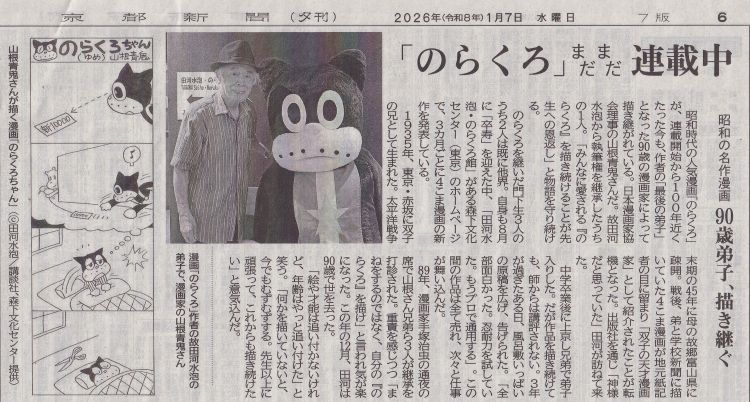 「山ね……」がどなたのことか、ブログを書いたときにはわかっておらず、それは今も変わらないのですけど、上掲新聞記事を読みながら山根青鬼さんと赤鬼さんの御兄弟ではないかと思うのです。戦後80年だった昨年の6月、読売新聞で報じられた幻の「のらくろ」が載っている「戦時版よみうり」が見つかったという報道で、田河水泡さんの仕事への関心が高まったことでしょう。なるほどそこに掲載された4コマ漫画には、「田河水泡」ではなく「田河水包」の文字になっていますね。漢字一つとっても、切迫した時代の空気を感じます。