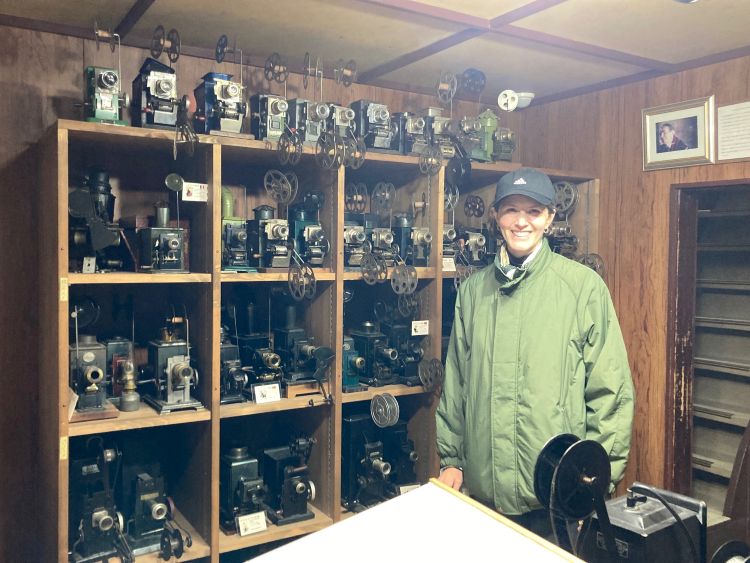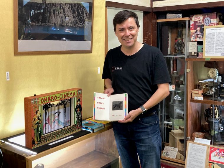 WAAPAで映画を教えておられるので、展示している“オンブロチネマ”のみならず、手にしておられる本『ギャロップ‼』(ルーファス・バドラー・セダー著)のこともご存じでした。でも11月に展示品に仲間入りしたばかりの“オンブロチネマ”なので、オルゴール付きのアニメーションをご覧いただきながら、記念に写真を撮りました。
