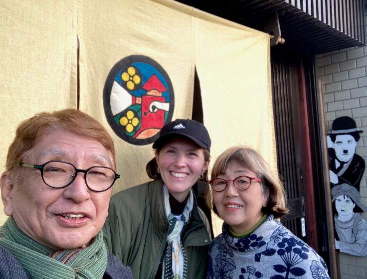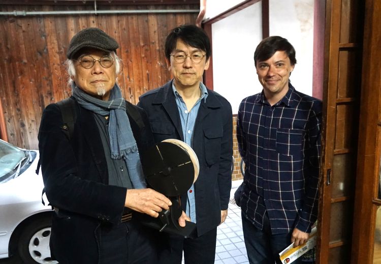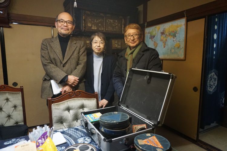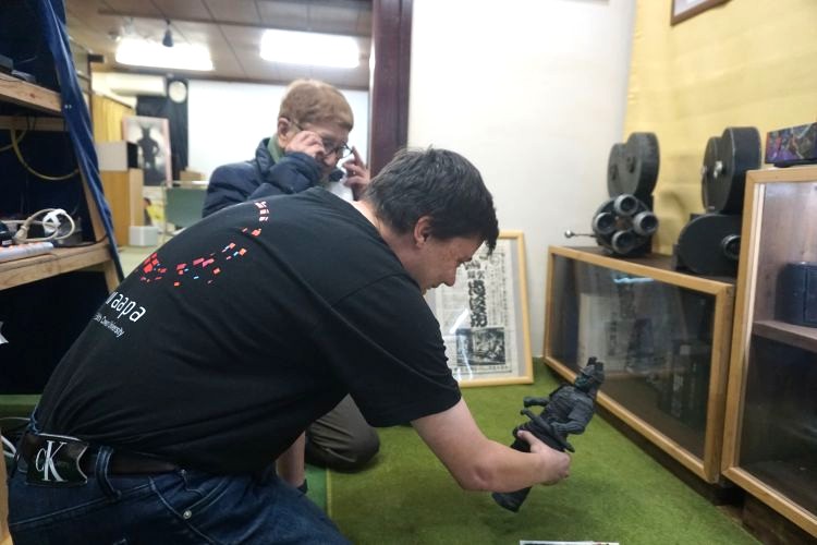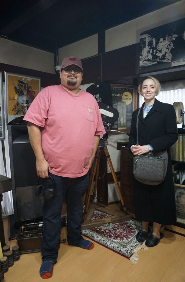 アーカイブの仕事をされているというJonny Lay Avilaさん(向かって左)がアメリカのサリナスから、続いて、現在は京都アメリカ大学コンソーシアム(KCJS)の先生をされているベイツ大学アジア文化学科准教授ジャスティン・ウィッシンガー先生がお越しくださいました。このパテ・ベビーフィルムの作業を居合わせたみんなで眺めながら、この骨董品屋さんとの会話も交え、要所要所ジャスティンさんに通訳してもらいながら、何とも愉快な時間を共有しました。結局、骨董品屋さんの期待には沿えない結果でしたが…。平松先生ご夫妻とは話が盛り上がり、その効果もあったのか、正会員にもなって応援して頂くことになり、フィルム13本も寄贈いただくことになりました💕