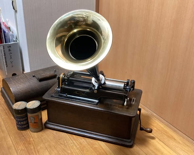 実は4日朝、今年初めの東寺ガラクタ市で、この骨董屋さんから上掲エジソンの蠟管蓄音機を買いました。一生懸命磨き、ピカピカになり、鳴らなかった音に関しては、Xで「どなたか教えてください」と呼び掛け、呼応してくださったVictanさんの取説を公開された動画 https://www.youtube.com/watch?v=QNIR2R_w7zI を見て再生できました。大阪芸術大学の柳知明さんから「EDISON HOME model B のおそらく後期型。本来は2分蝋管用のモデルですが、1908年から発売された4分蝋管を再生できるように2分用と4分用を切り替える“コンビネーション・アタッチメント”が付いています」と教えて頂きましたので、120年近く前の音色が楽しめるようになりました。で、件の骨董品屋さんは京都に来るついでに立ち寄ってくださったのですが、「もっと珍しいのが手に入った」と話すと、機械好きの平松先生が興味津々の様子。傍で見ておられた奥様から断捨離を言われて、今回の来訪になったにも関わらず…。これは私も同様なわけで。