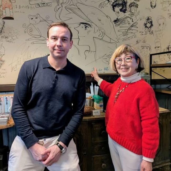 1月9日スイスのGary Carelさんが仕事で再来日されて、14時に京都国際マンガミュージアムを見学するからと連絡があったので、入口の前田珈琲店で待ち合わせをしました。壁一面に有名なマンガのキャラクターが描かれていて、「あしたのジョー」の前で記念写真を撮りました。昨年10月4日、11月6日に次いで3回目と短期間のうちに再会できてびっくりぽん。ドイツ語、フランス語、英語、イタリア語、中国語、日本語と驚異的な語学力を有しておられるので、出来上がったばかりのフランス語のチラシをお渡ししました。「よくできている」とのお墨付きを貰いました(翻訳に尽力してくださった皆様に感謝です)。「でもまだ英語版ができていない」と言ったら、「翻訳してあげます」と彼。ありがとうございます、ゲーリーさん![]()