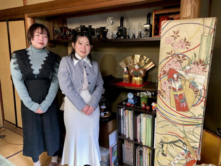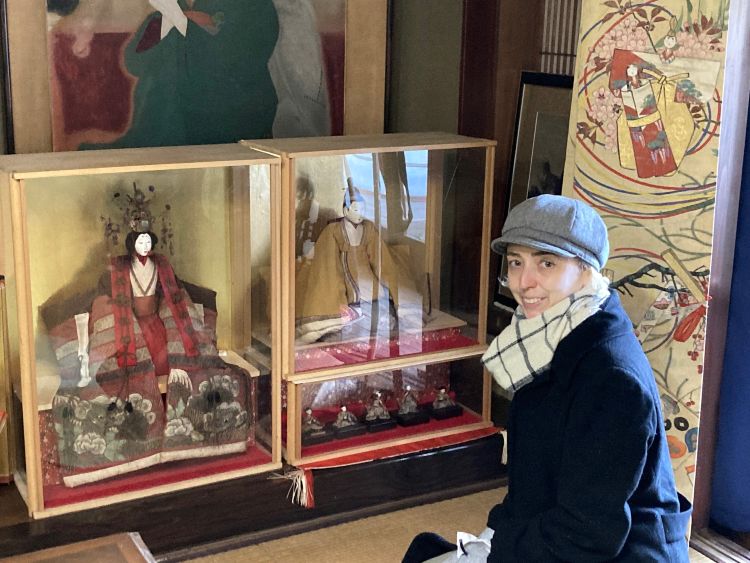 奥のは古今雛。古いので、抜け毛が気になりますが、今年はどうにか宝冠を被せることができました。群馬からお越しくださった松井さんです。