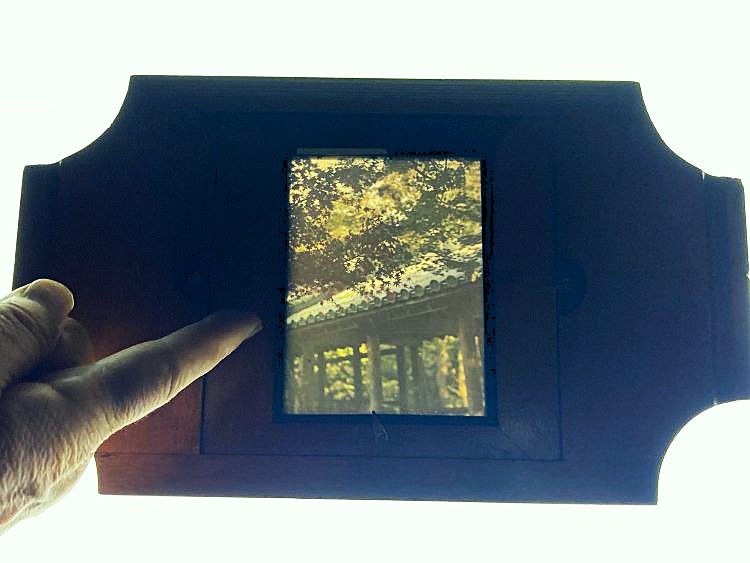 これはその中の1枚を幻灯機のスライドにセットして、裏からスマホのライトをあててみた時の1枚。この時のことは、こちらで書いています。 “オートクローム”は“シネマトグラフ”発明で知られるフランスのリュミエール兄弟が1903年に特許を取得しました。1907年に写真乾板の形式で一般販売され、日本にはその翌年1908年に渡来しました。それまでのモノクロ写真ではなく、上掲写真でお分かりの通りカラーの写真です。 “オートクローム”はコダックがコダクロームを販売する1930年代まで、主要なカラー写真の手法のひとつでした。