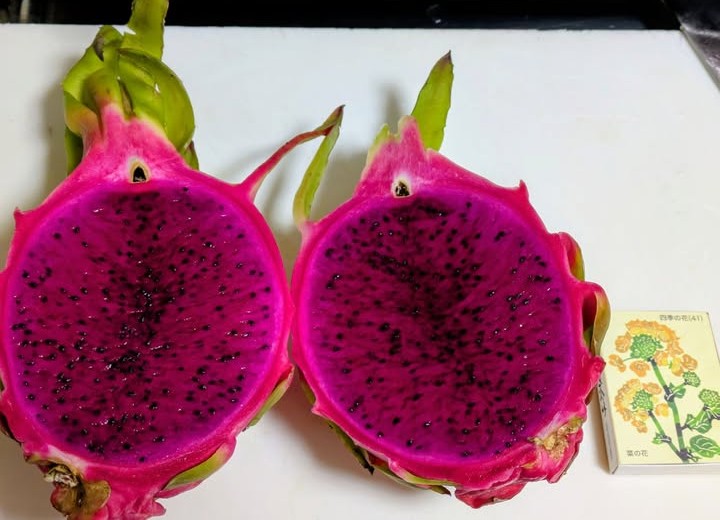 しばらく眺めていましたが、食べごろもあるだろうと半分に切ったのが、これ。引き出しにあった懐かしいマッチの小箱と並べて撮りました。こんなに大きいです。皮は綺麗にツルリと剥けました。かつて、職場に沖縄出身の若者がいて、お土産にもらったことがあり、その時の記憶と同じさっぱりした味。その時みたドラゴンフルーツの色より格段にビビッドです。「そういえば」と、引き出しの中から、そのドラゴンフルーツで白い絹を染めてスカーフを作ってみたことを思い出し、久々にそれを取り出して羽織ってみました。