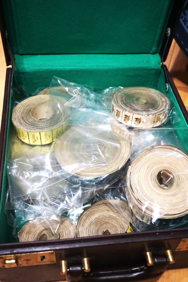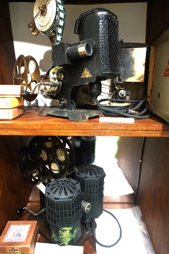 上段がレフシーの紙フィルムと映写機。送り孔(パーフォレーション)がコマとコマの間に1つあります。下段が家庭トーキーです。送り孔は2つあります。この映写機はライトボックスが2つあり、いくぶん上段のものに比べて明るく投影できたでしょう。初めて紙フィルムを他の小型映画と共に展示した時のブログです。良ければご覧ください。おそらく往時も薄暗い中で、目を凝らしながら襖や壁に貼った白い模造紙に映し出される映像を御覧になっていたことでしょう。色のついた動くマンガをレコードの音声付きで見ることができて、随分楽しい時間だったことでしょう。とても高価な玩具でした。