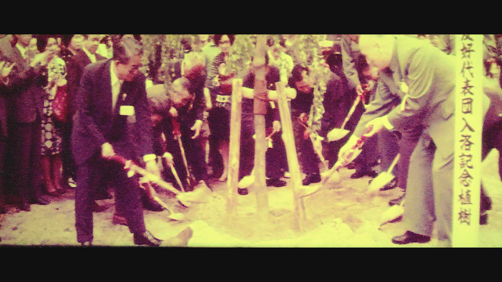 円山公園では、西安市友好代表団の京都訪問を祝って記念植樹。両市の友好が、すくすくと育ちますように。この友情の心を託して、シダレエンジュが両市長の手によって植えられました。