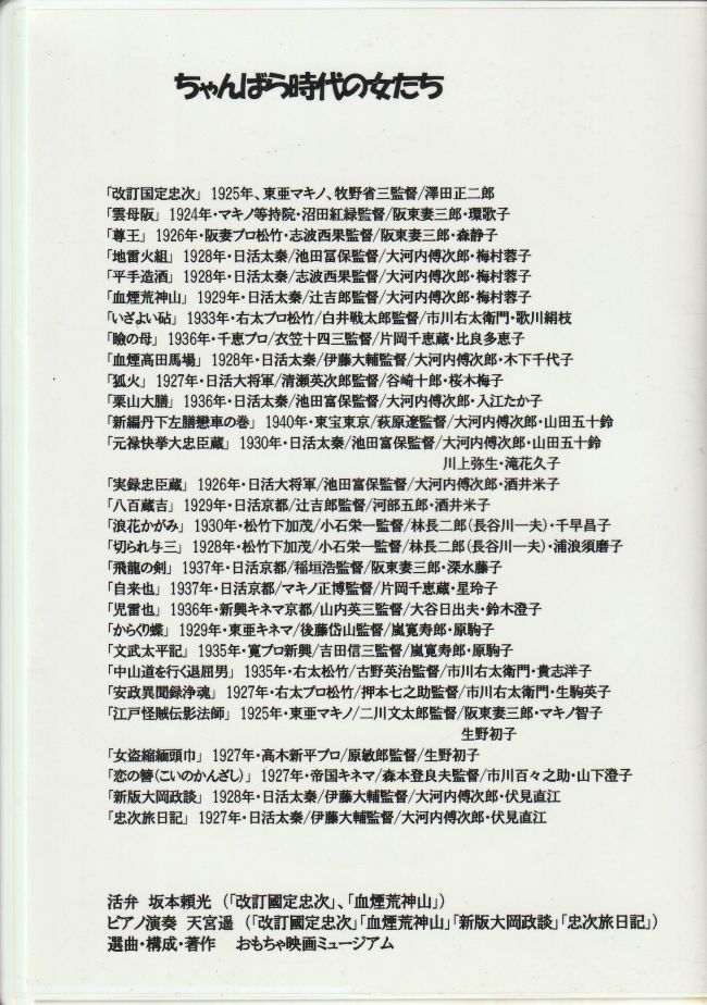 DVDには、『改定 國定忠次』と『血煙荒神山』の2作品を、京都国際映画祭で坂本頼光さんに活弁上映して頂いたときのものを使用しました。もしもお手元にこのDVDがございましたら、14日の大森さんの活弁と聞き比べてお楽しみいただきたいところ。台本は活動写真弁士さんがそれぞれ書かれますので、同じ素材でも見方、考え方が反映していて面白いです。演奏は共に天宮遥さんですが、活弁士さんの出方によって演奏も変わってくるので、それこそ即興演奏の醍醐味が味わえます。